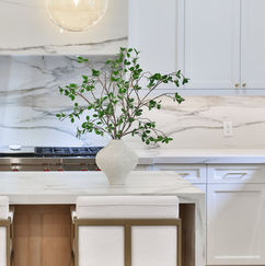 For the Sherwood Park Residence, the client came to us with a clear vision: a warm, natural, and elegant home that feels modern and airy. Every design decision was made to support this feeling — creating a space that is welcoming, refined, and effortlessly functional. The layout was carefully planned to connect the kitchen, dining area, and pantry into one cohesive space. While each zone has its own purpose, the flow between them feels natural and seamless, making the home ideal for both everyday living and entertaining. To maintain a clean, modern look, we designed custom millwork with integrated black accent handles instead of traditional hardware. This detail adds a subtle contrast while keeping the overall look sleek and refined. The kitchen features floating shelves that frame and highlight the stunning stone surfaces, which continue seamlessly across the backsplash, hood, and waterfall island. This uninterrupted materiality adds depth and texture to the space, while allowing the beauty of the stone to become a true centerpiece. Yet, even with these bold moments, the design remains balanced — soft, inviting, and completely in tune with the client's vision of a home that feels timeless, personal, and thoughtfully crafted.
